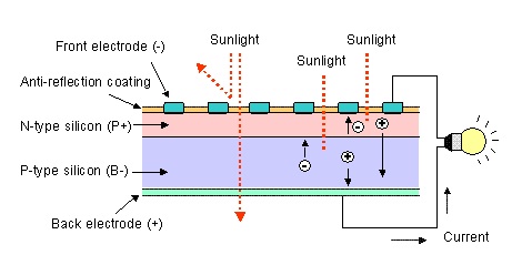 N-Type silicon, which is located in front of the cell, most components are ready to donate Electrons but still has some mixing little Holes. In front of N-Type side, there will be a layer of metal called Front Electrode, responsible to accept Electrons. For P-Type side which is located at the back of cell, main structures are Holes, but still has some mixing little Electrons. At the back of P-Type side, there will be a layer of metal called Back Electrode, responsible to gather Holes.